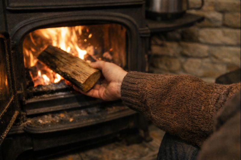 薪ストーブの前に座り、一本の薪を炎にくべる。